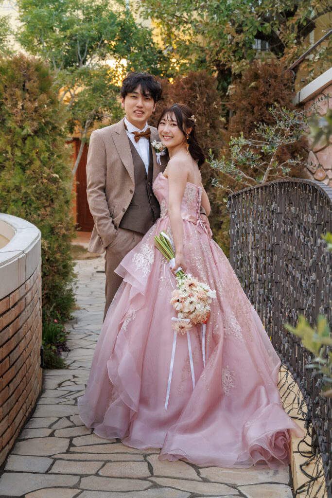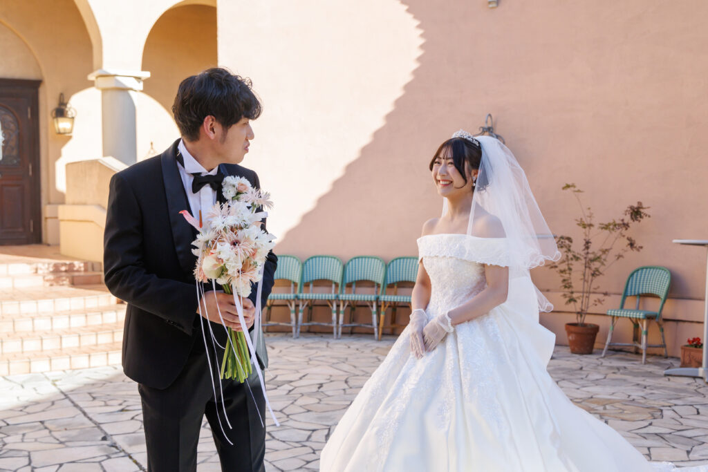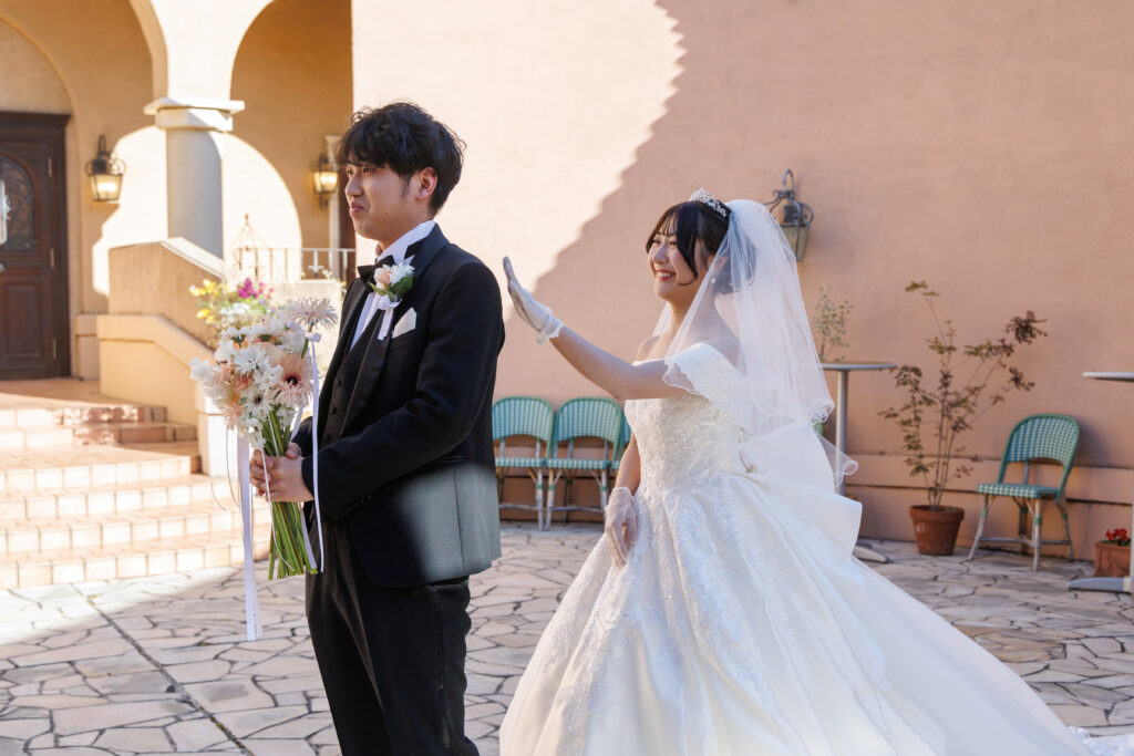 どんな衣装を選んだのかはお互いに知っていても、メイクやヘアセットも含めたトータルコーディネートが仕上がった姿を初めて見られるのはこの一瞬だけ。照れながらもお互いの姿を確認しあうこの瞬間、おふたりは温かい空気に包まれました。言葉はなくても、特別で愛おしいファーストミートになりました。
