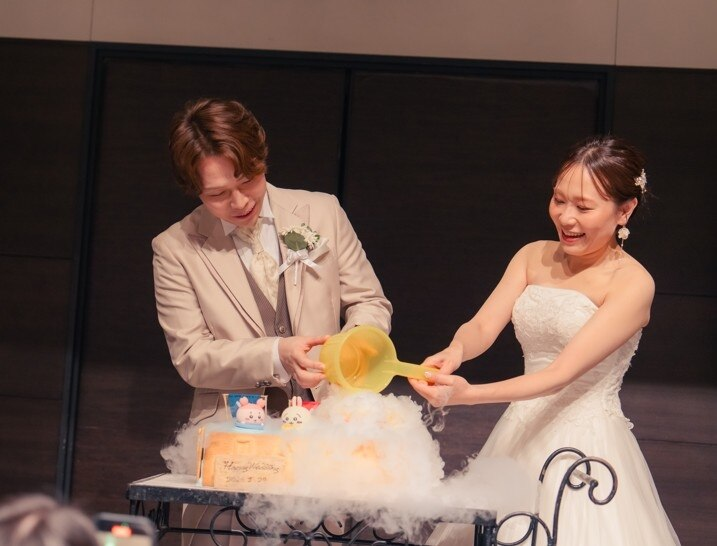 銭湯が大好きなおふたりらしい、遊び心あふれる演出が登場したのはケーキのセレモニーの時間。 用意されたのは、ドライアイスの演出で湯気が立ち上がる”入湯スタイル”のウェディングケーキ。 まるで本物のお風呂のように、ふわりと広がる白いスモークに包まれ、会場からは驚きと笑顔、そして歓声が溢れました。 ゲストの記憶にも深く残る、笑顔と温もりに満ちた特別なワンシーンとなりました。