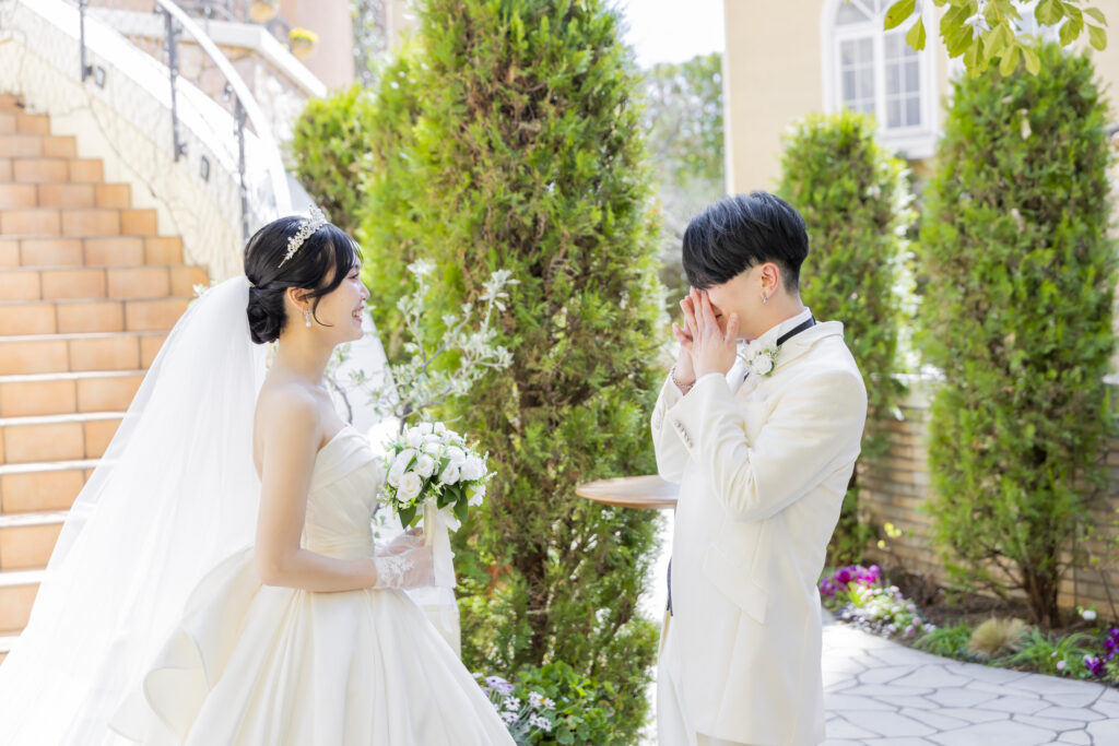 新婦からの想いが綴られた手紙を静かに読み終えた新郎。胸いっぱいに広がる気持ちを抱えながら迎えたファーストミートでは、新婦の姿を目にした瞬間、思わず涙があふれました。その涙にはこれまでの感謝や愛情、そしてこれからの未来への決意が込められています。おふたりの絆の深さが伝わる、感動に満ちたひとときとなりました。