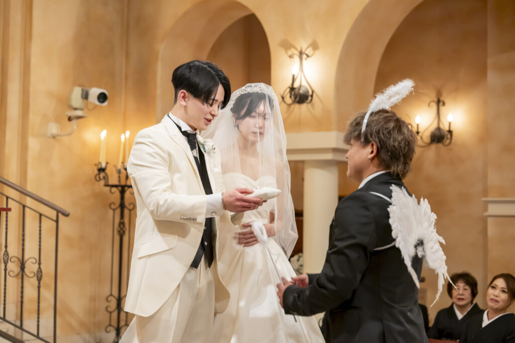リングセレモニーでは、ゲストによる心温まるサプライズが用意されていました。天使の衣装に身を包んだ可愛らしい姿で登場し、大切な指輪をおふたりのもとへと運びます。思いがけない演出に、会場は驚きと笑顔に包まれ、自然と和やかな雰囲気に。ゲストも一緒に創り上げる、温もりあふれる印象的なワンシーンとなりました。