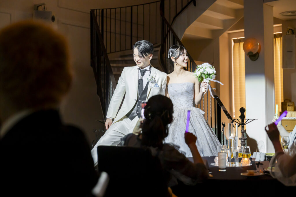 お色直し後の再入場では、新郎が自らヘアスタイルを手がけて登場し、美容師としての高い技術とセンスを披露しました。一方で新婦も装いを新たに、美しく華やかな姿で会場を魅了。おふたりが並んだ瞬間、洗練されたスタイルと輝く笑顔に、ゲストから大きな歓声が上がりました。それぞれの魅力が引き立つ、印象的で特別なワンシーンとなりました。