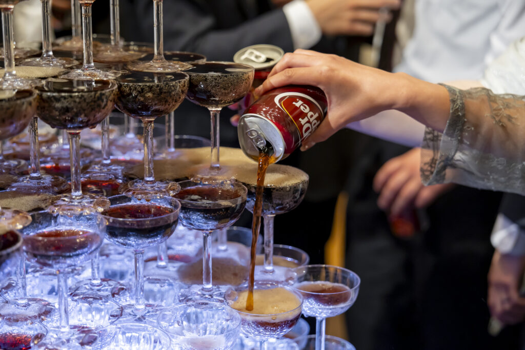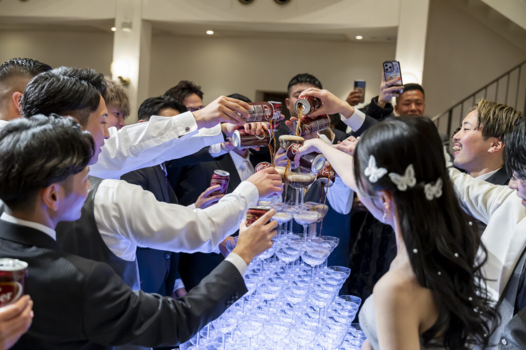 披露宴のクライマックスを飾ったのはシャンパンタワーの演出。しかし注がれたのはシャンパンではなく、おふたりらしい遊び心が詰まった「ドクターペッパーで」した。ゲストと一緒にグラスへと注ぐたびに笑顔と歓声が広がり、会場は一体感に包まれます。型にとらわれない自由な発想で、忘れられない楽しい時間となりました。