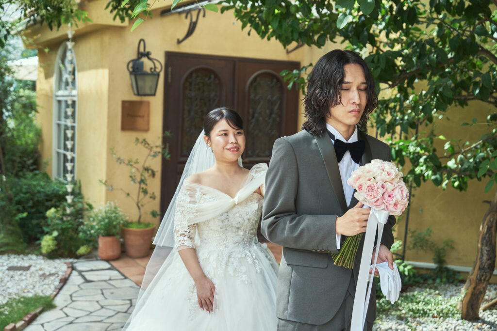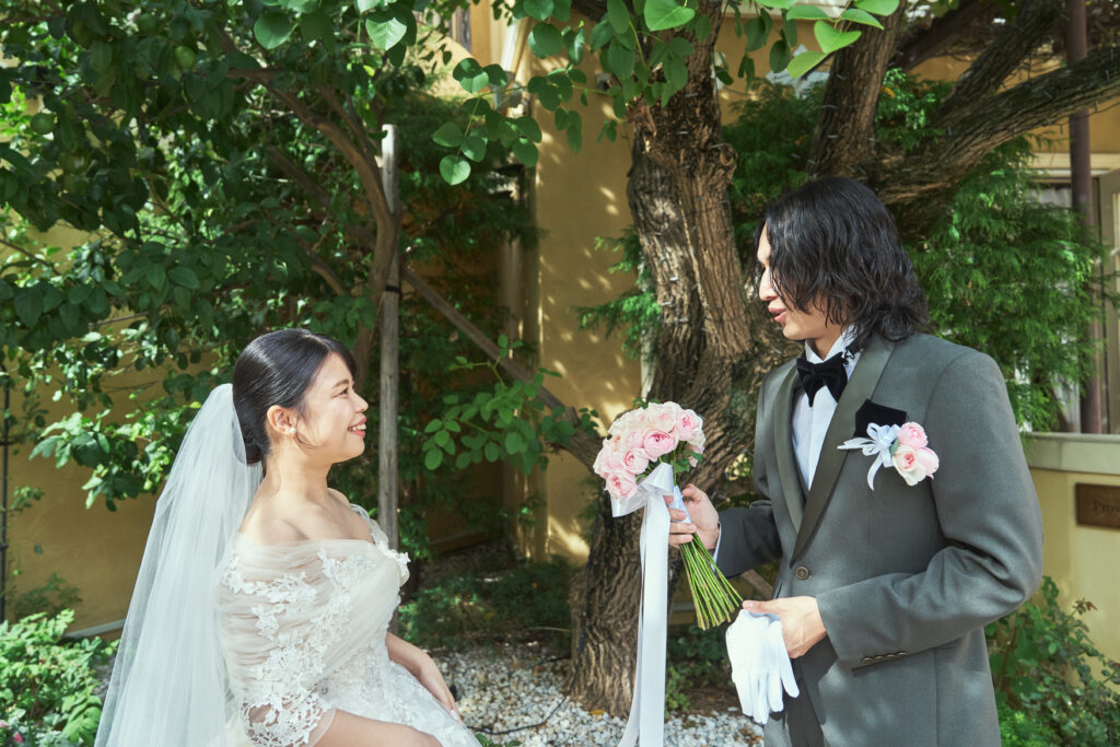 柔らかな光と緑に包まれたガーデンで迎えたファーストミート。お互いの姿を探すようにゆっくり歩み寄り、振り返った瞬間にふたりの表情がぱっとほころびました。緊張がふっとほどけ、笑顔がこぼれた特別な時間。鳥のさえずりや風の音までもが祝福しているようで、自然の中だからこそ生まれる温かなワンシーンとなりました。