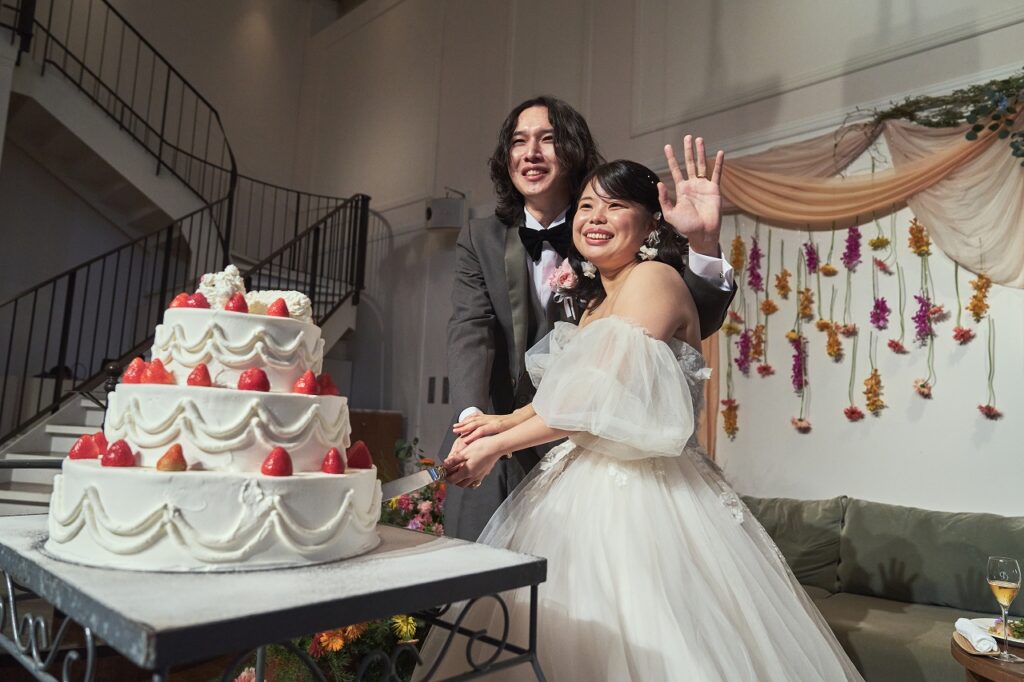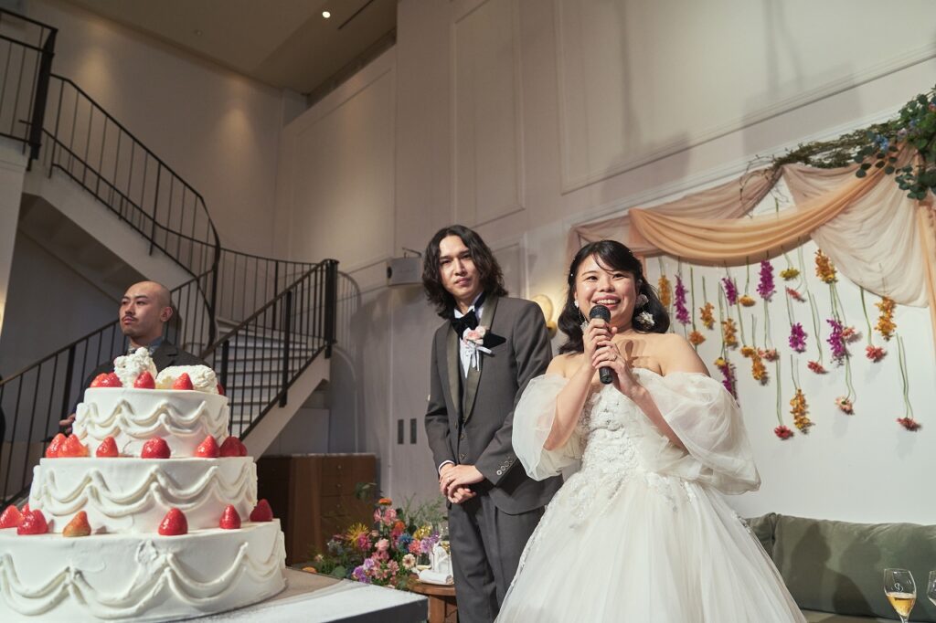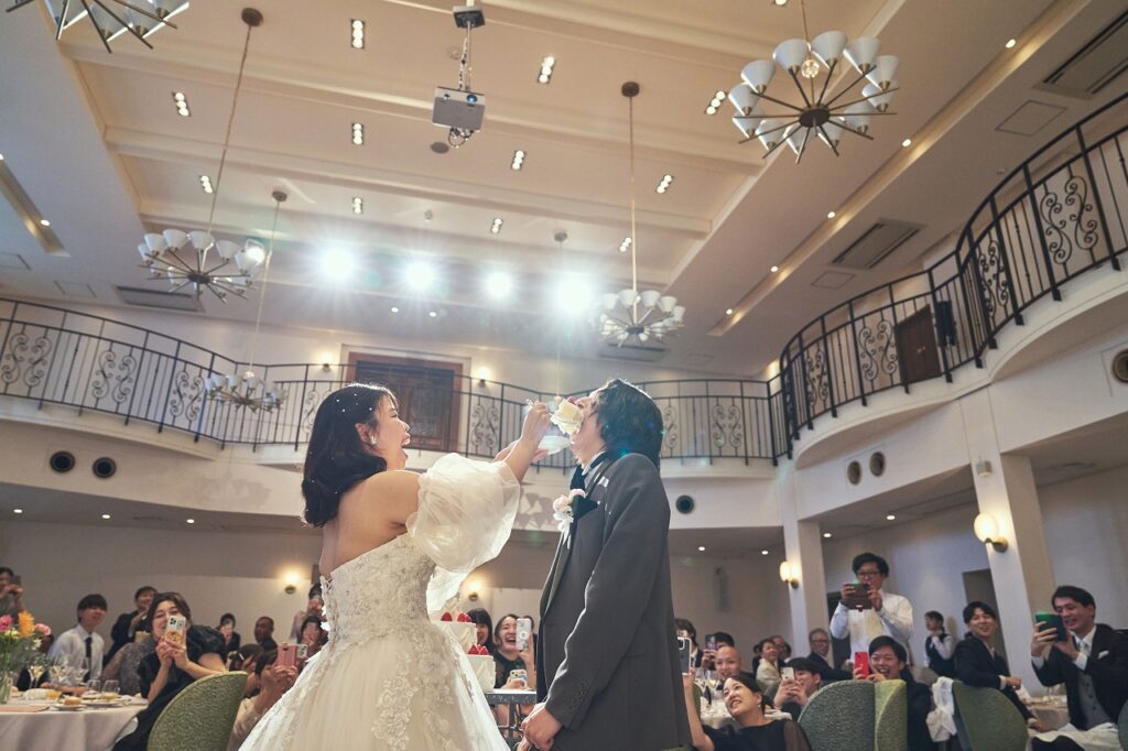 披露宴のスタートを彩ったケーキ入刀。おふたりが息を合わせてナイフを入れる瞬間、会場は笑顔と祝福の拍手に包まれました。その後のファーストバイトでは、お互いへの想いが伝わる可愛らしいシーンに。「美味しいね!」と笑い合う姿に、ゲストも思わずほっこり。写真にも思い出にも残る、甘くてあたたかなひとときに。