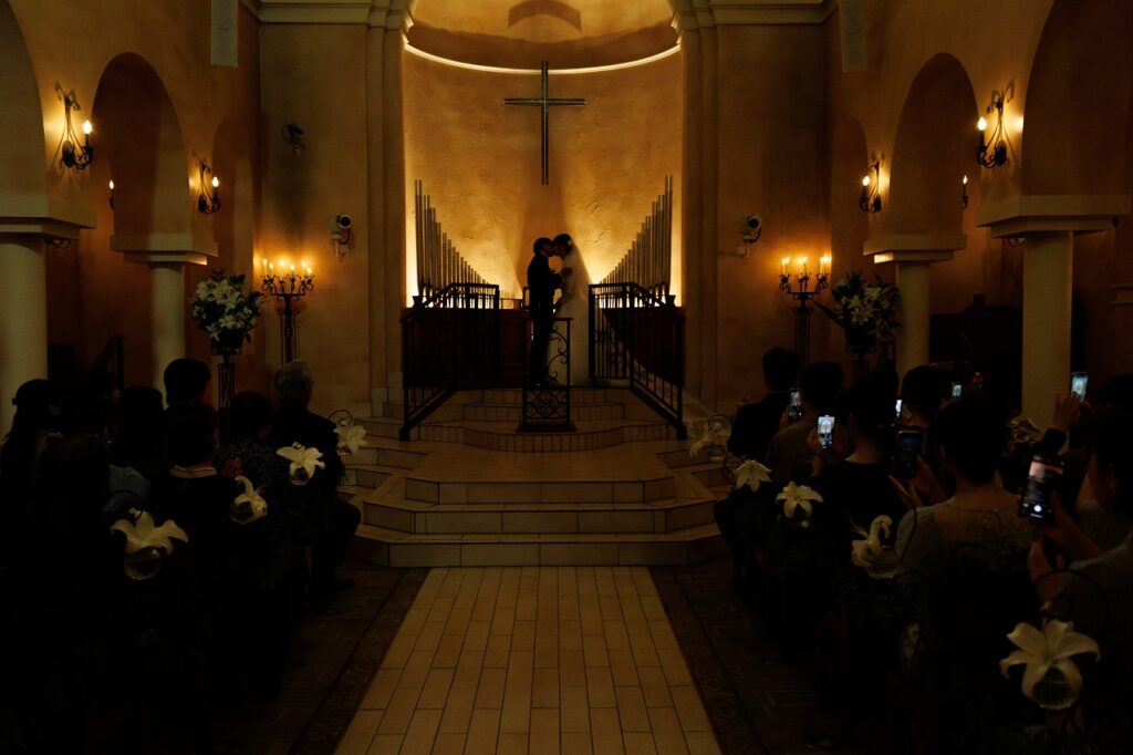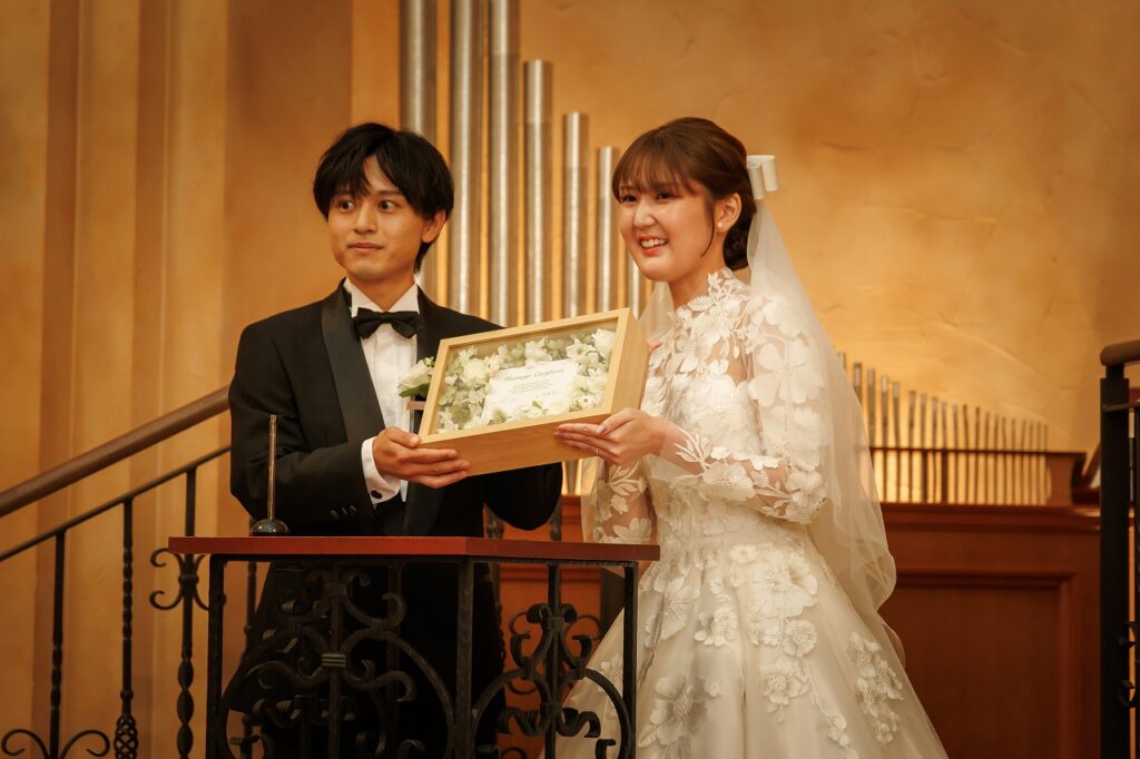 大切な人たちに見守られながら、おふたりらしい言葉で想いを伝えた人前式。決まった形にとらわれず、「これがいいね」と話しながら創り上げた進行は、まさに世界にひとつの誓いのかたち。ゲストの賛同の拍手がそのまま結婚の証となり、会場全体があたたかな空気に包まれました。笑顔と祝福が溶け合う、心に残る挙式となりました。