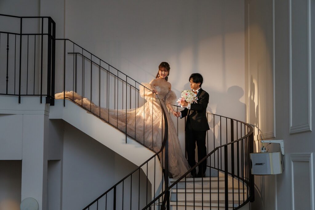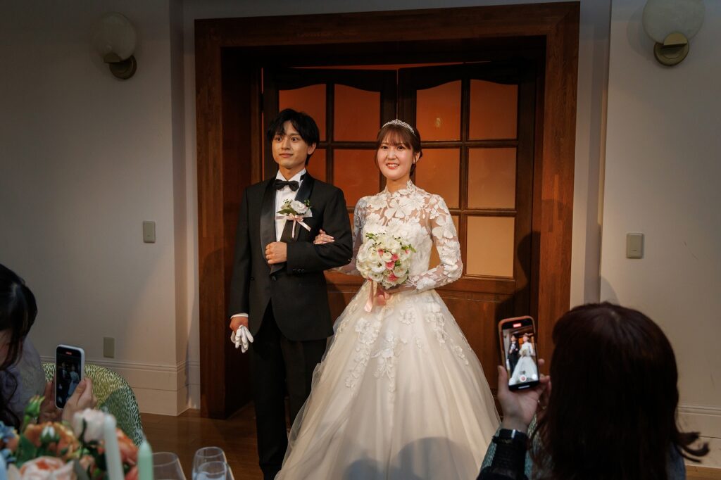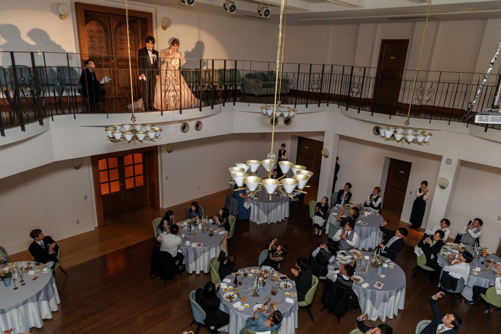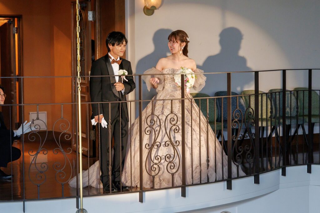 披露宴後半は、2階からのドラマチックな再入場でスタート。扉が開いた瞬間、会場全体から大きな歓声と拍手が沸き起こりました。上からゲストの笑顔を見渡しながらゆっくりと階段を降りる姿は、まるで映画のワンシーンのよう。光と音楽に包まれながら、おふたりらしい華やかな時間が再び始まります。会場に一体感が生まれた、印象的な入場シーンとなりました。