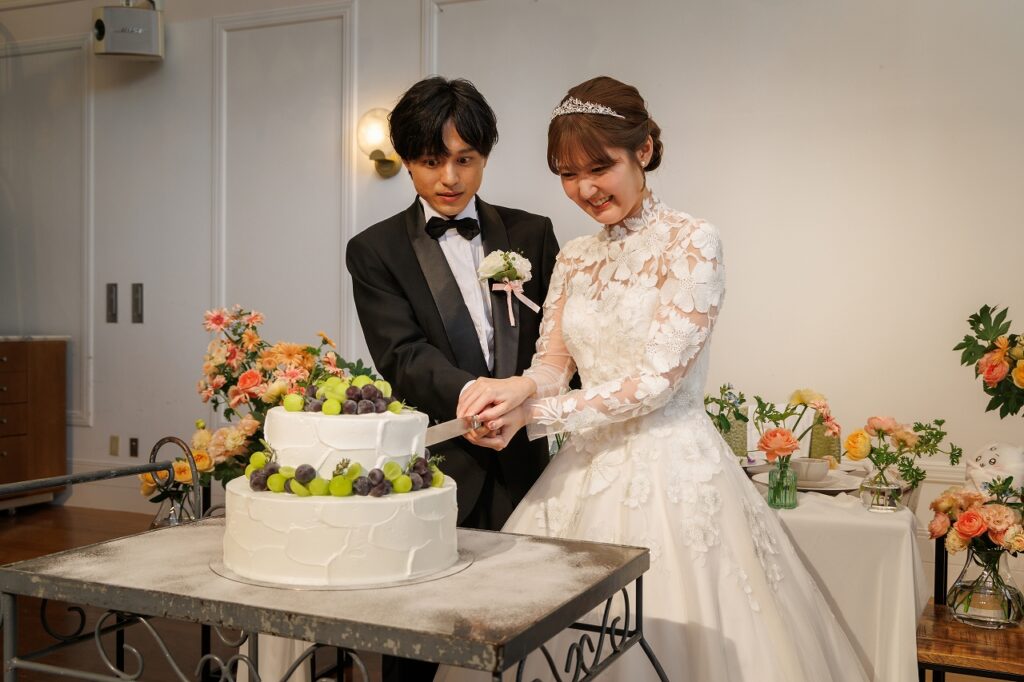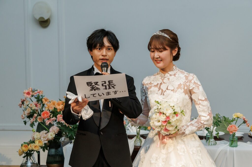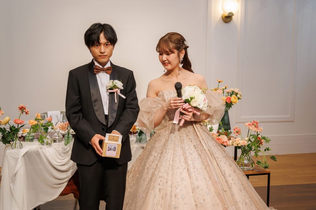 挙式のあとは、ゲストとゆっくり過ごす披露宴の時間へ。おふたりが選んだコーディネートや音楽が会場を彩り、テーブルには想いのこもったメニューが並びました。会話や笑顔が自然と生まれ、にぎやかで温かな空気に包まれたひとときに。感謝の気持ちを伝えながら、大切な人たちと過ごす時間が、より一層ふたりの絆を深めていきました。